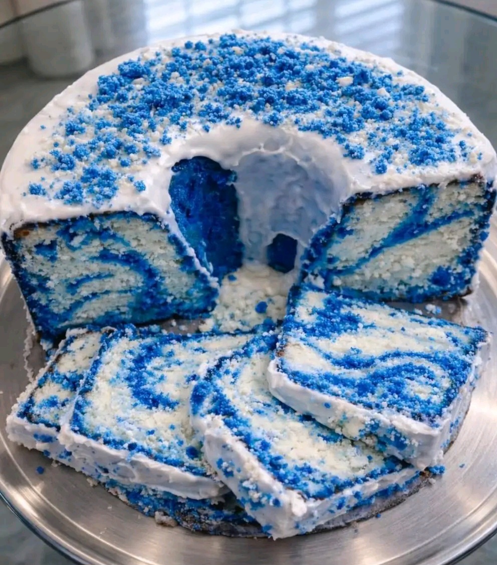 ext, add your flour and continue to mix. Careful not to overmix the batter. Stop mixing as soon as ingredients are incorporated. Now add your heavy cream. I used a spatula to slowly incorporate the heavy cream and folded it into the batter. This way I avoid overmixing. Scoop out 1 cup of batter and add 1 tsp of cocoa powder along with 2 tsp of butterfly pea powder and mix until itβs well incorporated. Spray your bundt pan with baking spray and add approximately half of the batter. Then, using an ice cream scoop, strategically place scoops of the butterfly pea powder as a layer on top of the batter. Add the rest of the batter and use a knife to swirl.