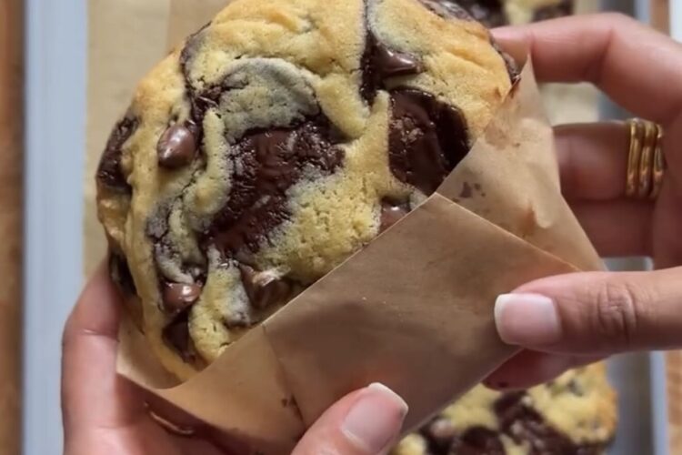 Scoop 2 tablespoon-sized balls of dough onto the prepared baking sheet. Leave the dough balls slightly rough and stacked, with a rustic texture. Place 4 cookies on each pan, leaving 4 inches of space between each one. Top with extra chocolate chips.